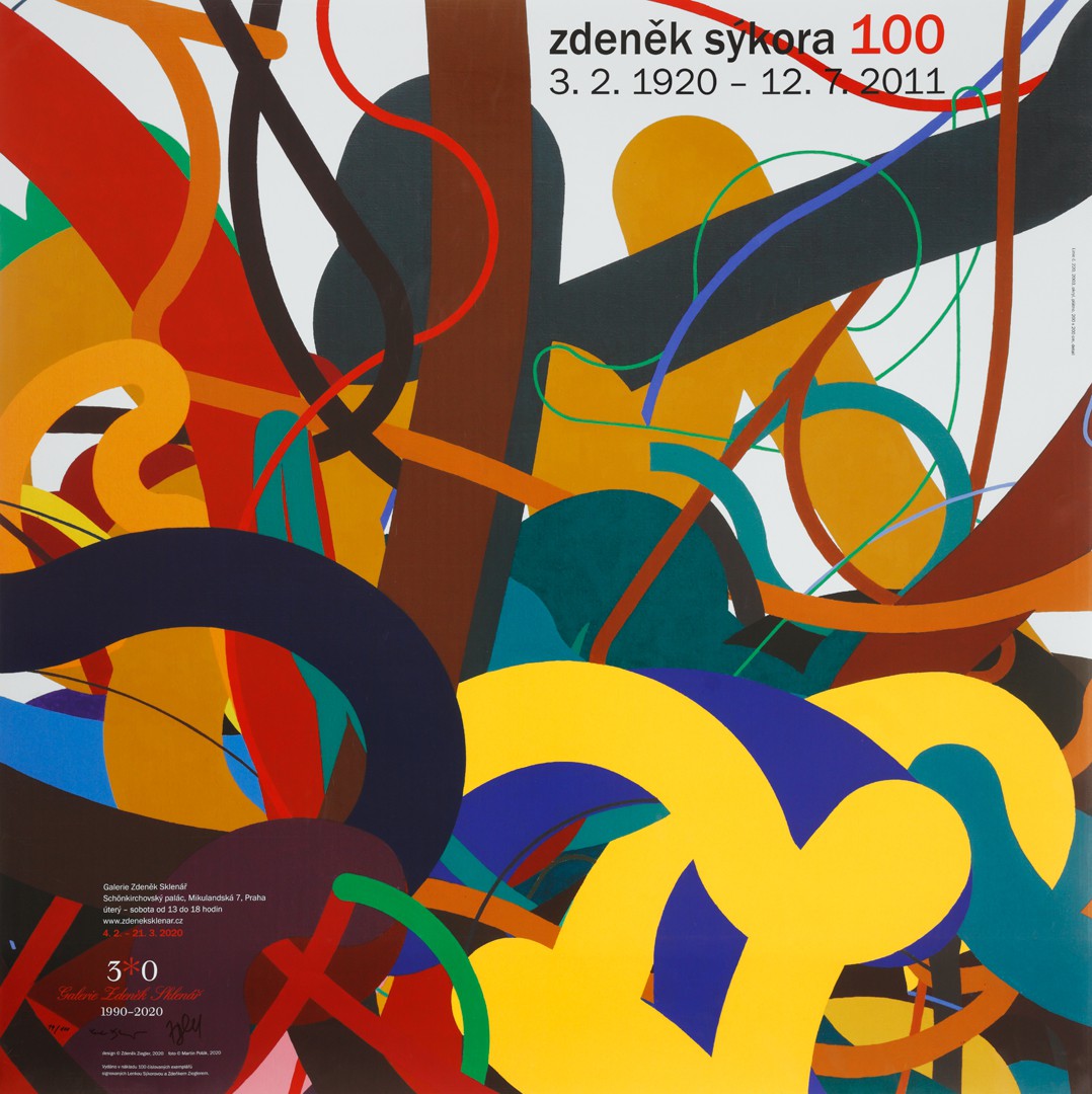 Plakát vydaný u příležitosti stejnojmenné výstavy Zdeněk Sýkora 100, konané od 4. 2. do 21. 3. 2020 v Galerii Zdeněk Sklenář – Schönkirchovský palác, Mikulandská 7, Praha.