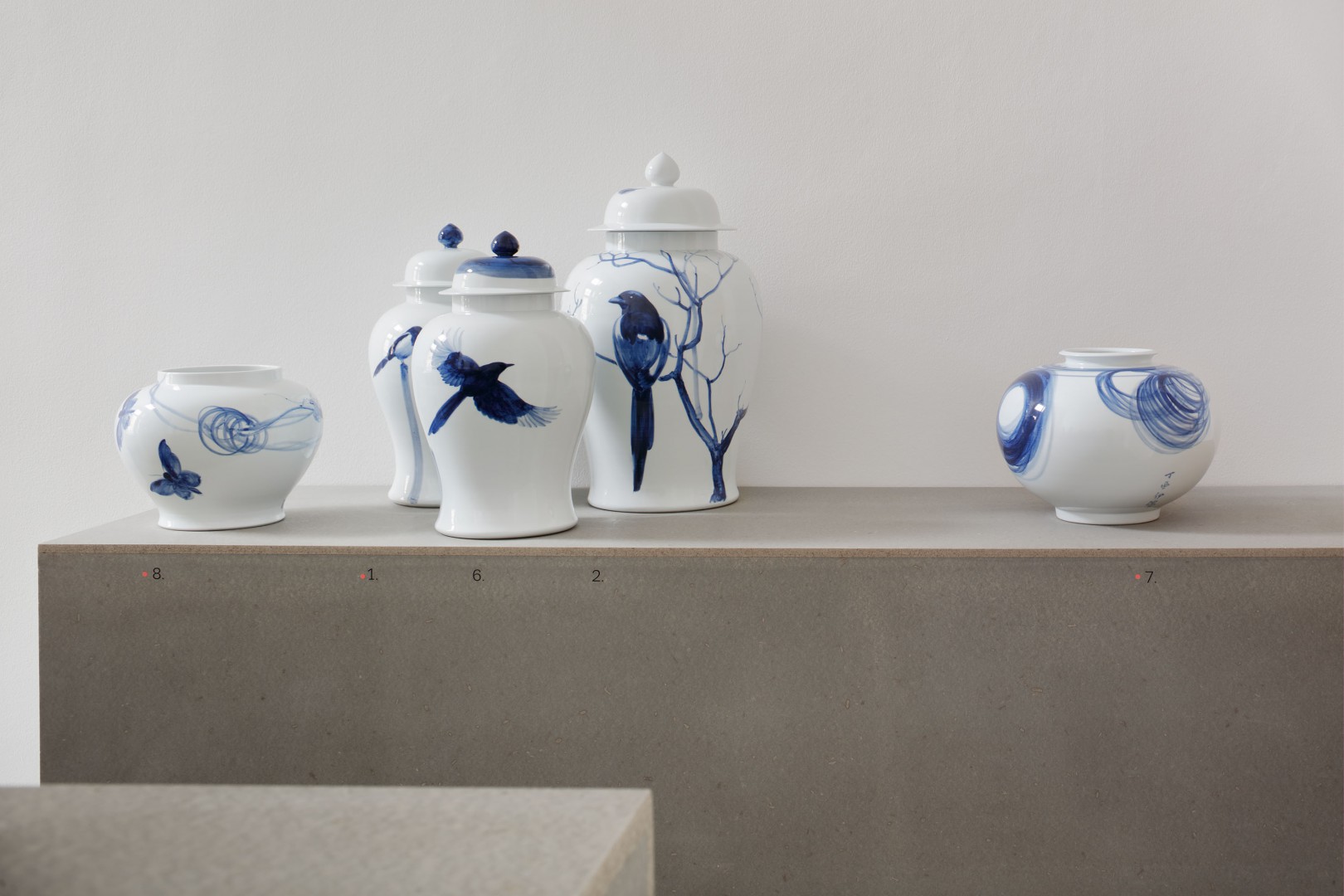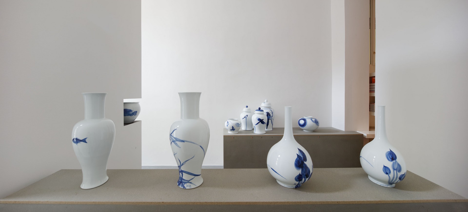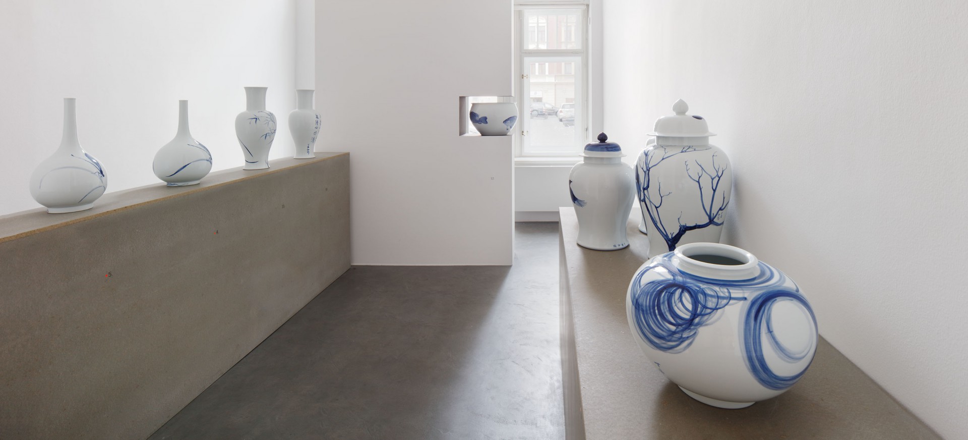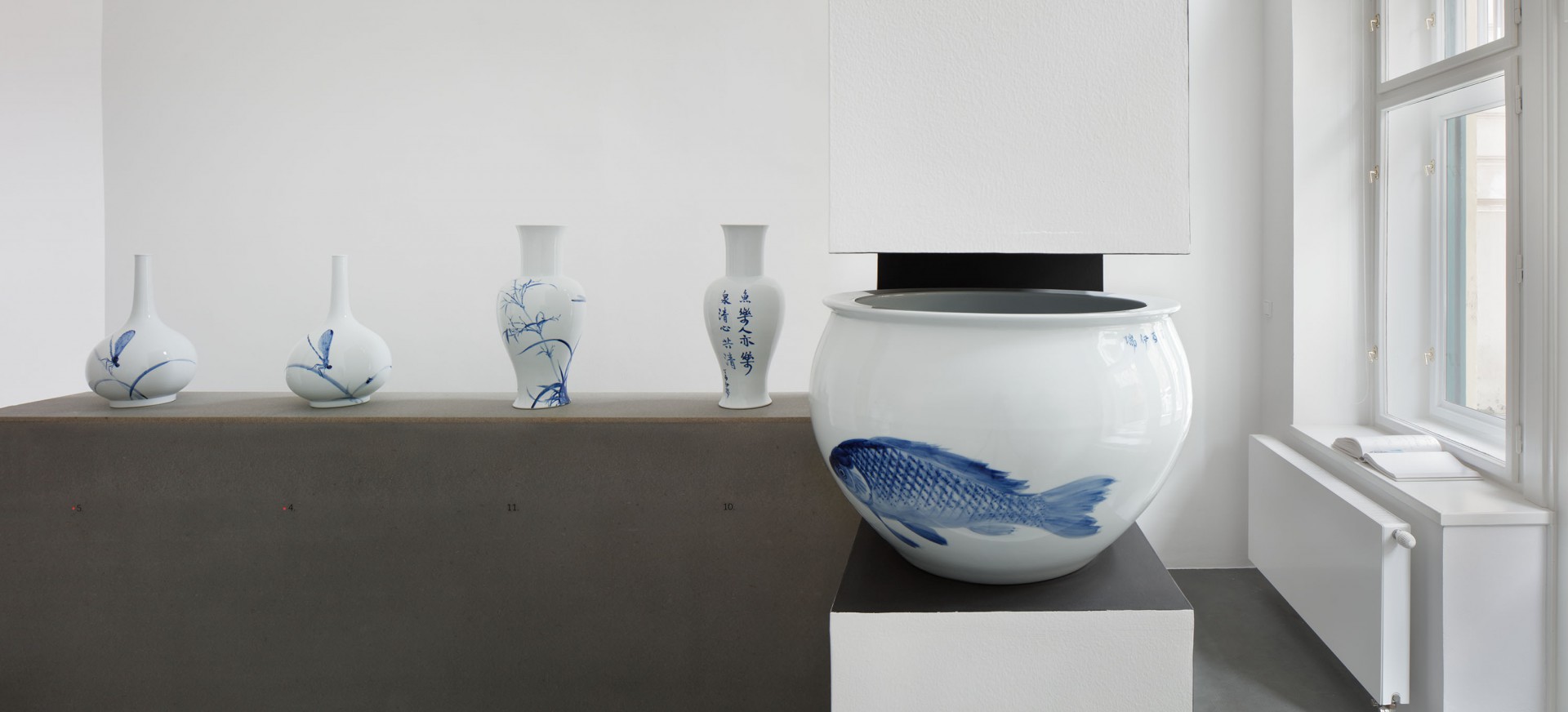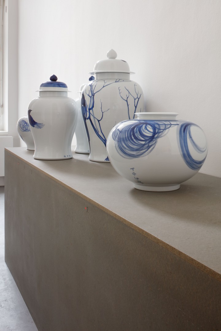 Právě významové bohatství tohoto zdánlivě prostého média mě zaujala a přivedla k práci na několika souborech modrobílého porcelánu, kdy využívám tradičních tvarů (tvary pocházející z období Yuan a Ming) ve spojení s neobvyklým zpracováním dekoru. Do kontrastu s tradičním tvarem porcelánu stavím dekor využívající tvarosloví staré evropské malby ve spojení s typickými čínskými motivy (hmyz, květiny, ryby…) ale i s motivy každodenní reality současných čínských měst. Na rozdíl od tradičních způsobů výzdoby neurčuje často rytmus a kompozici dekoru linie, ale rozsáhlé plochy ve spojení s jemným stínováním a lavírováním.