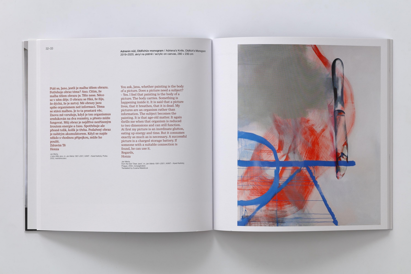 Podtitul Janě a Jiřímu Ševčíkovým s láskou vyjadřuje Mertův hluboký vztah k uznávané a neopomenutelné dvojici českého výtvarného života posledních desetiletí; několik úryvků z jejich po léta vedených dialogů katalog obsahuje. Ústřední texty jsou pak dva. Básník, spisovatel a literární historik Petr Hruška provází Mertovými obrazy až meditativně, pohledem zasvěceného, soustředěného, vnímavého a okouzleného poutníka. Výtvarná publicistka a kurátorka Lenka Lindaurová krátce přibližuje význam manželů Ševčíkových, atmosféru doby a s ní spojeného uměleckého provozu. Jiří Ševčík (1940–2022) zemřel nedlouho po skončení výstavy.