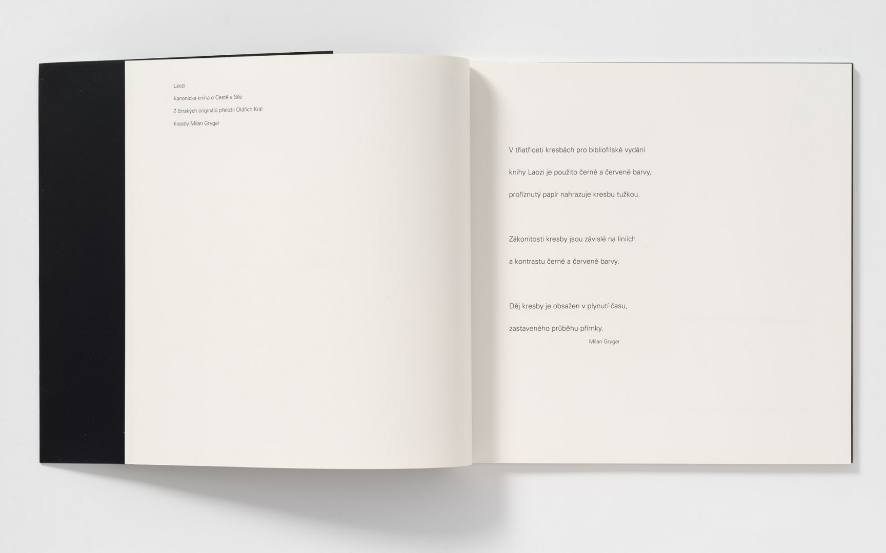 Kniha kreseb předního českého umělce Milana Grygara vyšla v nákladu 300 číslovaných a signovaných výtisků u příležitosti výstavy Emil Filla a Milan Grygar konané ve dnech 14. 10. – 14. 11. 2009 v Galerii Zdeněk Sklenář v Praze. Originály kreseb doprovázely bibliofilskou úpravu překladu věhlasného sinologa Oldřicha Krále LAOZI – Kanonická kniha o Cestě a Síle, která byla vydána v nákladu 33 výtisků. Bibliofilie byla představena při slavnostním zahájení výstavy 13. října 2009.