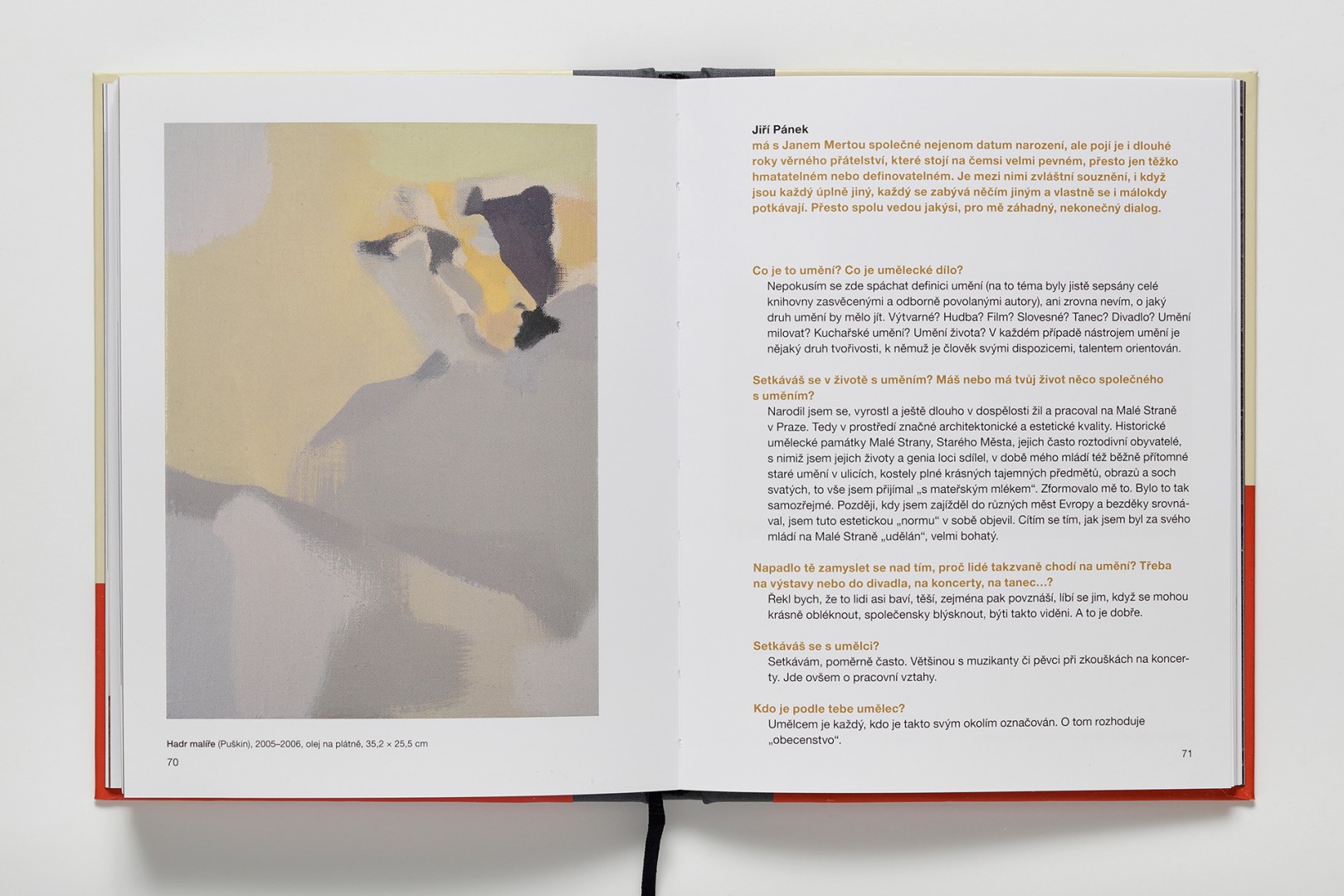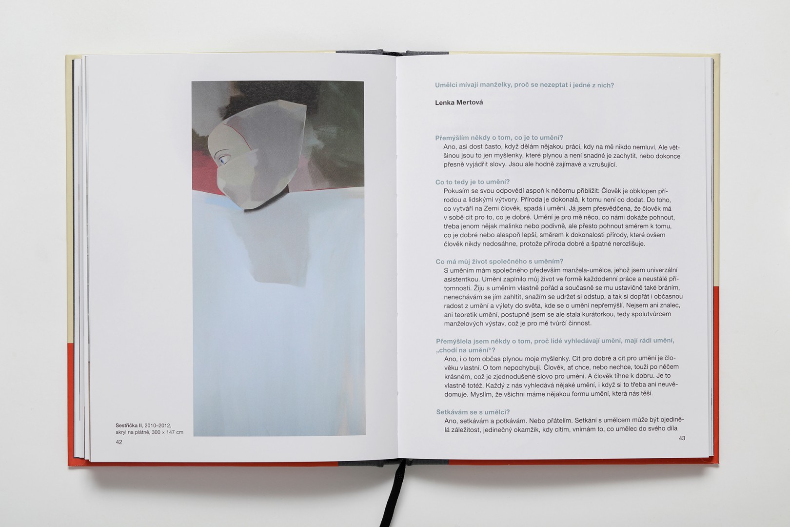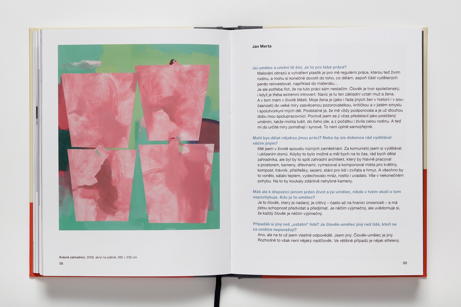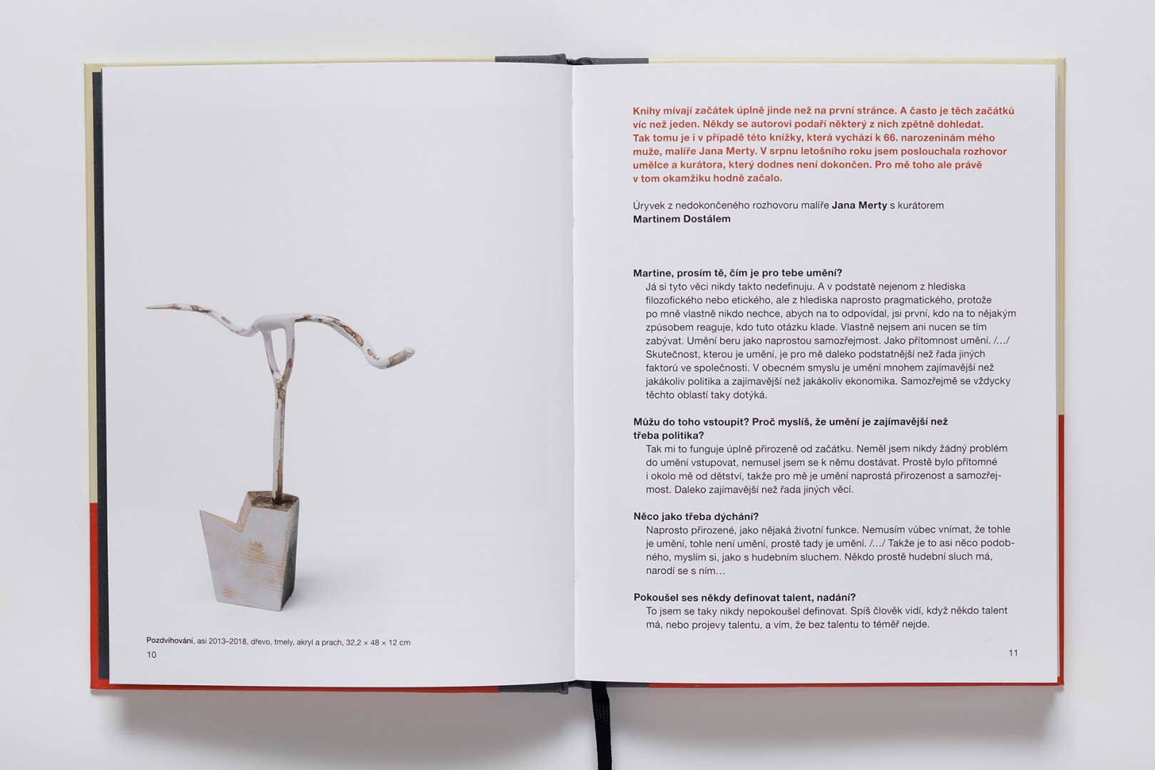 Kniha připravená k 66. narozeninám malíře Jana Merty a vydaná Galerií Zdeněk Sklenář u příležitosti stejnojmenné výstavy pořádané ve dnech 5. 12. 2018 – 26. 1. 2019 měla začátek v rozhovoru umělce a kurátora. Ten zatím nenabyl konečnou podobu, inspiroval však umělcovu ženu, Lenku Mertovou. Ptala se dál, položila otázky, na které začala hledat odpovědi. Vedla rozhovory s lidmi, kteří mají ke světu umění rozdílný vztah: s galeristou, kurátorem, autorem esejů o umění, s milovníky umění, kteří ale pocházejí ze světa umění vzdáleného, s „tramvajákem“, jenž se s výtvarným uměním potkává jen náhodně, s přáteli Jana Merty, s ním samotným i sama se sebou. Jan Merta knihu věnoval památce svého přítele, letos zesnulého Oldřicha Krále.