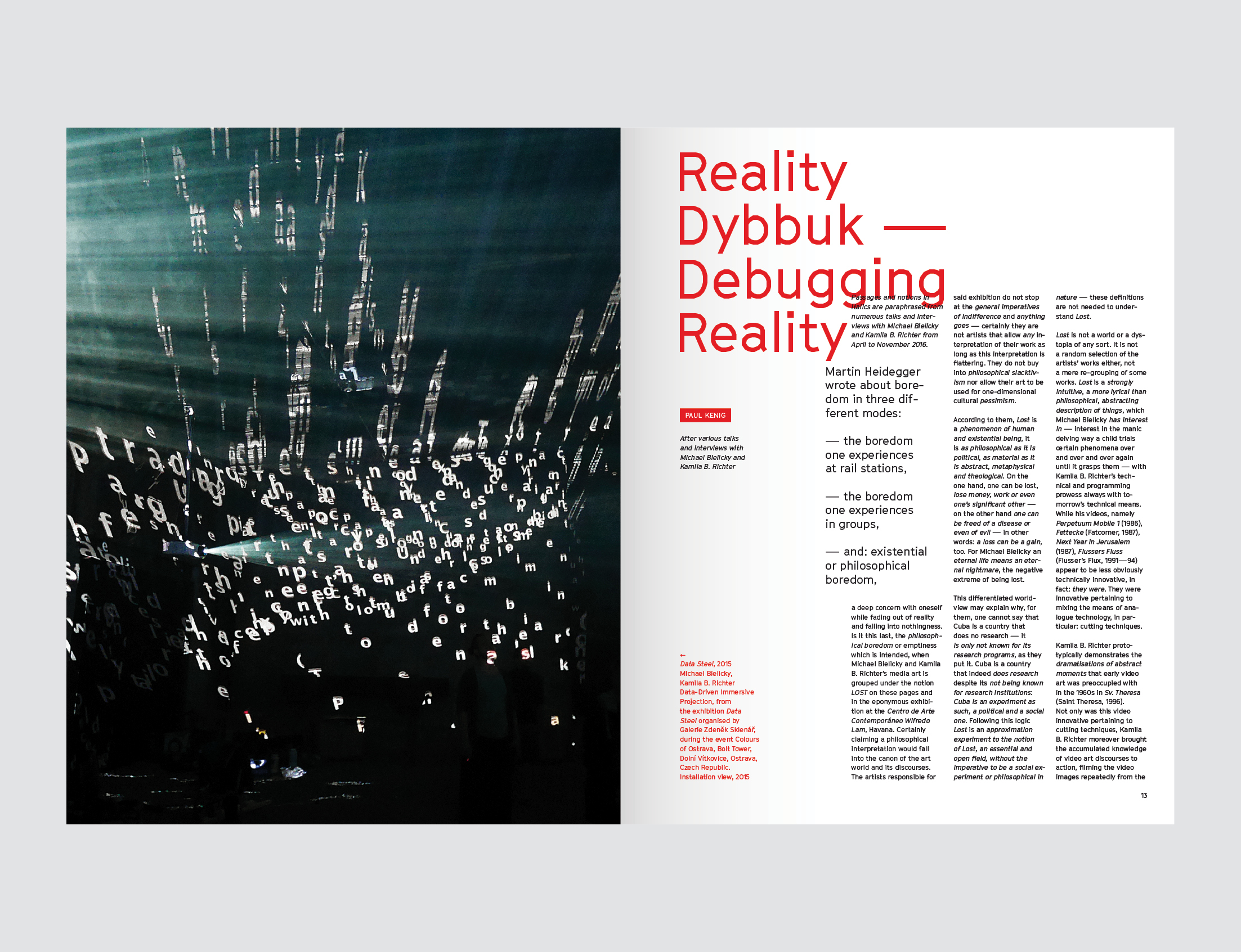 Přechod založený na interview zaměřující se na umělecké narativy Kamily B. Richter a Michaela Bielického rámuje Sloterdijkova a Weibelova revize tradic filozofické a estetické terminologie. Od roku 2007 toto umělecké duo vytvořilo pro své algoritmicky řízené animační umění pojem narativů založených na datech. Poskytují pouze technický rámec, který je napájen internetovými daty v reálném čase, jako jsou tweety, zprávy nebo texty, a abecedou skládající se z univerzálních piktogramů nebo písmen. Jejich na zakázku vytvořený software převádí náhodné alfanumerické internetové toky do kaskád piktogramů nízkoprahových vizuálních zpráv, které jsou obecně srozumitelné: bez ohledu na to, v jakém jazyce byl přijímající subjekt socializován nebo jaká jiná kulturní pravidla jej formovala. Algoritmy a datové toky generují své umění v reálném čase na obrazovce – umělci pouze propůjčují konfiguracím estetickou DNA. Umělci se tak vyhnou procesu produkce a opouštějí roli kreativních tvůrců. Přechod zaměřující se na interview je pokusem vystopovat jejich jedinečné biografie, které vedly k tak pozoruhodnému pojetí umění, právě tak jako pokusem vymyslet jakýsi čtvrtý modus nudy k Heideggerovým slavným třem modům z jeho inaugurační přednášky na univerzitě ve Freiburgu v roce 1929. Heideggerova třetí a finální forma nudy je existenční nuda, jak ji pociťujeme na nástupišti na nádraží, na místě určeném k čekání a pouze čekání, a tedy spadající do existenčního statusu – řečeno dnešním slavným výrazem – přílišného hloubání o věcech. Navržená finální podoba nudy v techno-civilizačním věku a se zuřivostí vyhýbání v plném rozmachu ve všech lidských bytostech, je být znuděný mezitím, kdy primární nástroj vyhýbání se – smartphone – uchvátil veškerou estetiku lidské interakce.